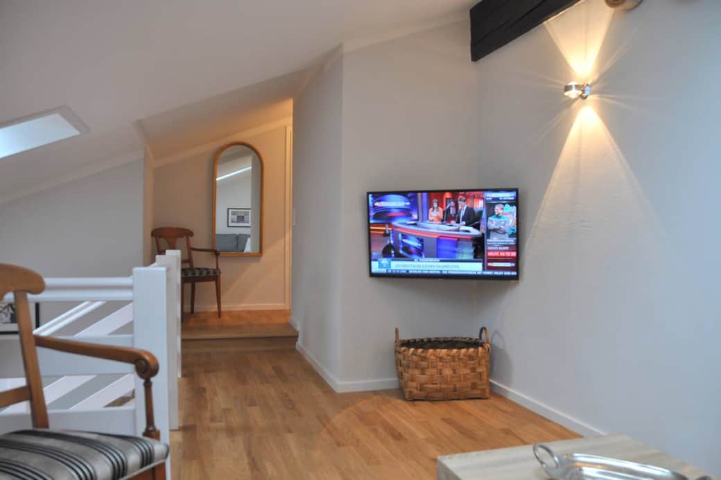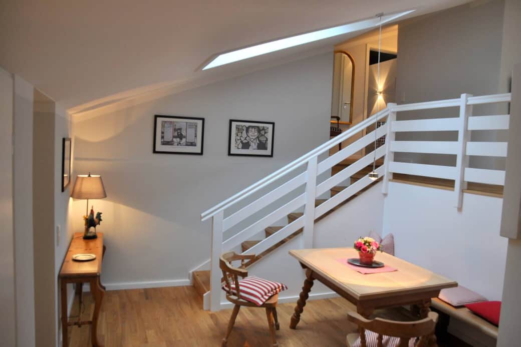 Charmante Suite über drei Ebenen: Eingang und Essbereich, unten Küche & Bad, oben Wohnbereich mit Sofa, Schlafzimmer mit Balkon und kleinem WC. Separater Eingang, Stellplatz sowie Platz für Fahrräder vorhanden. Herrlicher Blick auf Tegernsee & Berge – ideal zum Entspannen, nicht geeignet für Gäste mit Gehbehinderung.“